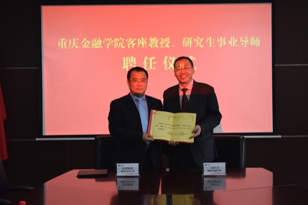 首先,银联重庆分公司总经理罗泳涛致欢迎辞,他表示随着金融科技的不断发展,支付平台经济的研究,相关监管的研究、市场状态的研究以及定价的研究,大数据、区块链的研究等行业发展前沿问题,作为传统最大的支付平台,发展遇到了一些阻碍,需要同高校大力合作,互通有无,故而,热切希望同公司多方面全方位开展深入的合作。随后,罗泳涛总经理和公司刁孝华经理分别代表双方签订了校企合作协议。刁经理代表公司给罗总颁发客座教授和研究生事业导师聘书。刁经理代表公司给授予实践实习基地牌。
