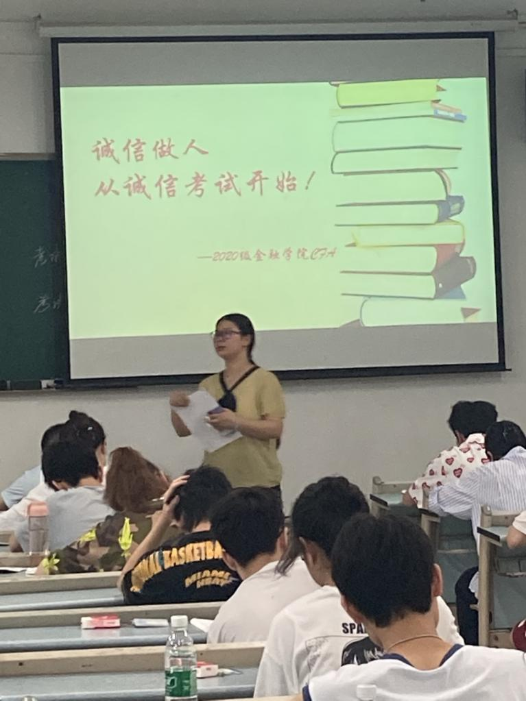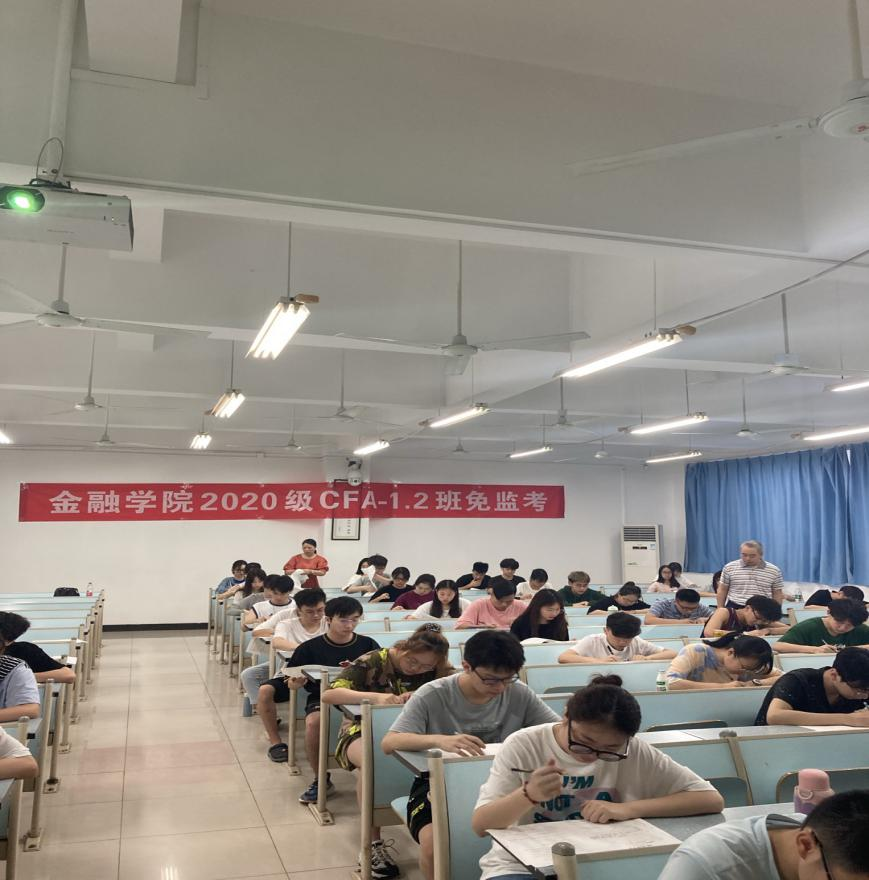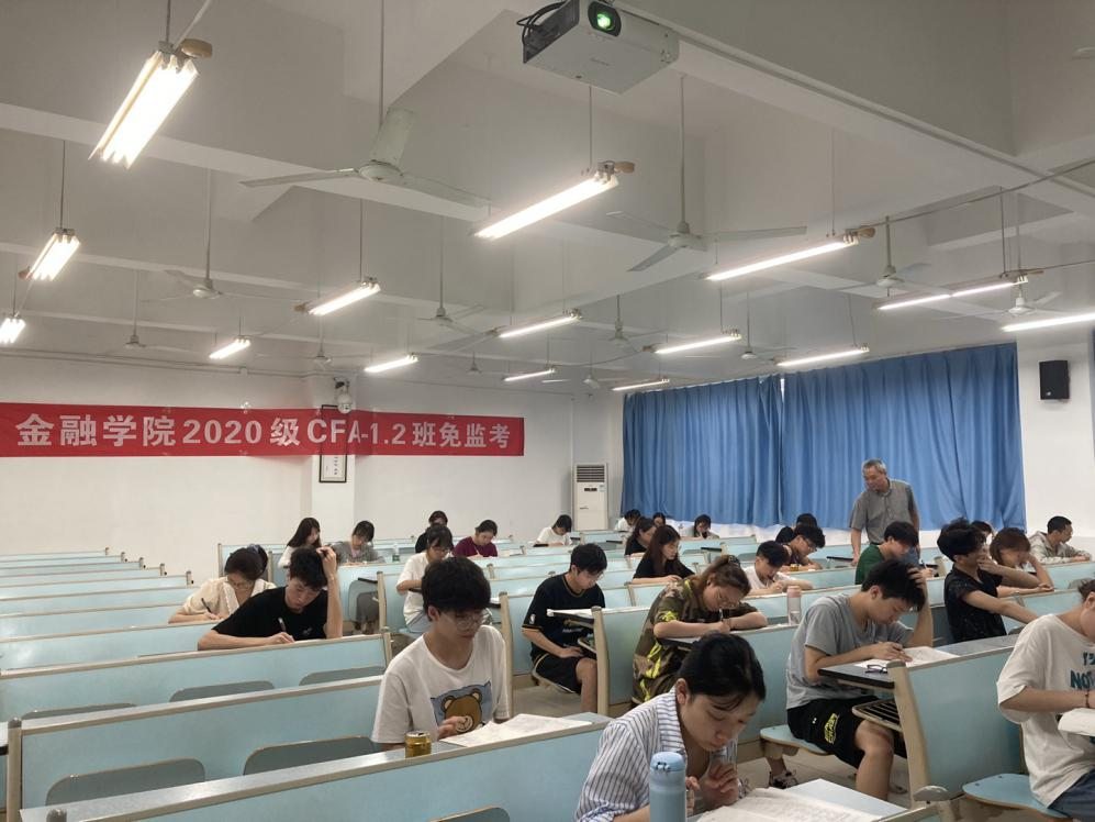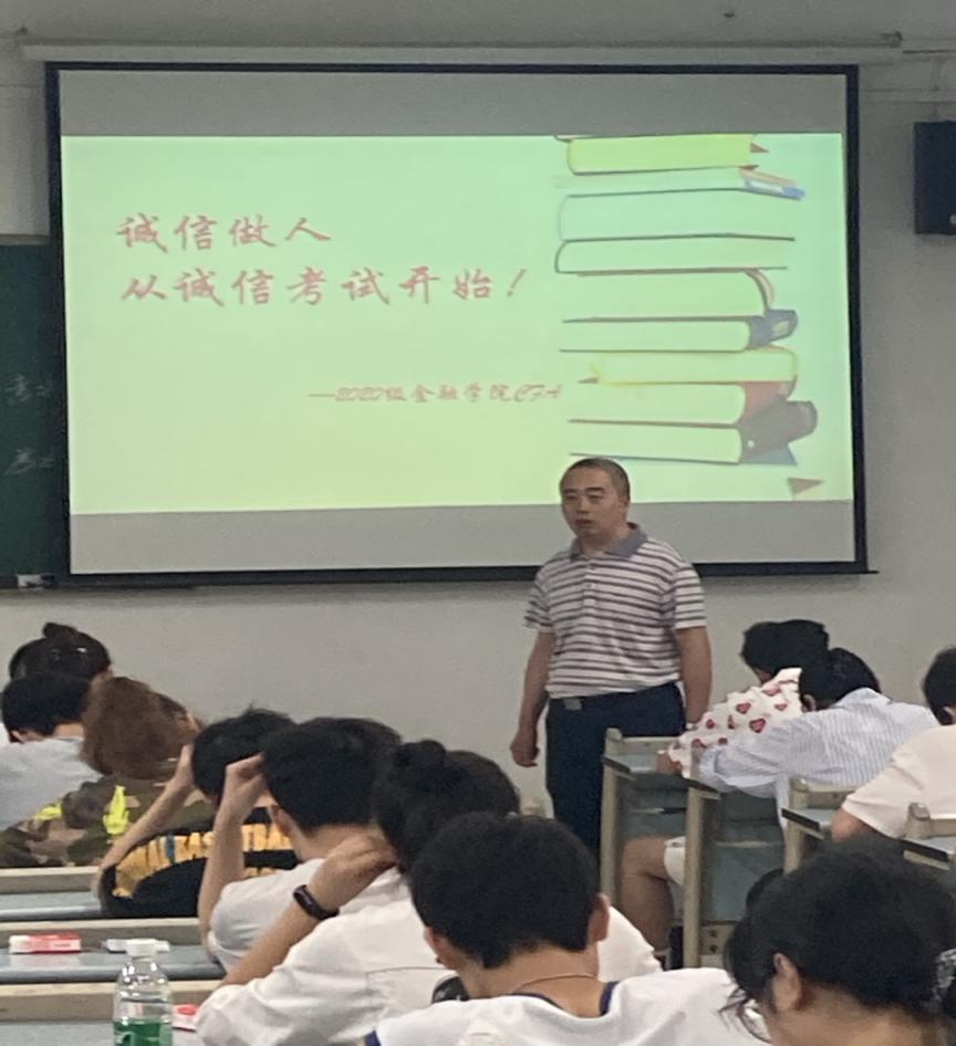 7月2日上午9:00,好博体育2020级CFA专业54名同学自愿申请在兰花湖校区20309教室践行了以“诚信做人,从诚信考试开始”为主题的《金融学》课程的“免监考”诚信考试。副董事长李国军、教务处处长骆东奇、党委学工部副部长尹建平到场巡考。