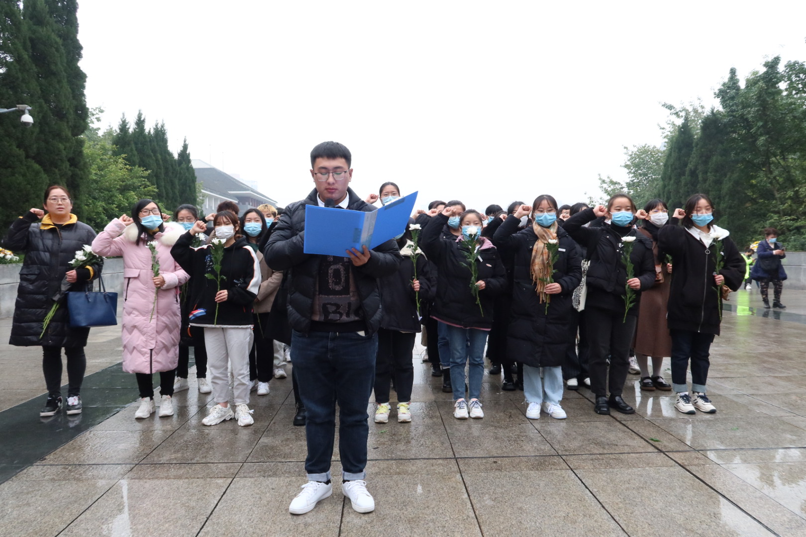 活动伊始,王兰讲述了“11.27”大屠杀惨案的悲惨经过及革命烈士英勇不屈的英雄事迹,她指出红岩精神是中国共产党和中华民族的宝贵精神财富,作为工商学子,同学们要铭记历史,传承红岩精神,珍惜来之不易的幸福生活,成长为国之栋梁。主持人介绍歌乐山烈士陵园并宣读祭文,表达出对牺牲的革命先烈们的崇高敬意。宣读完毕,全体成员默哀三分钟,缅怀革命先烈。默哀毕,青年代表诵读《红岩上红梅开》,讲述革命先烈的不朽传奇。而后,领誓人余超带领大家郑重宣誓。余新副书记带领大家有序向革命烈士敬献鲜花并向烈士墓碑鞠躬,她激励“红岩精神示范班”的同学们要牢记红岩精神“爱国、奋斗、团结、奉献”的八字内涵,争做优秀班级的排头兵,学以致用为中华民族伟大复兴贡献青春力量。扫墓活动后,同学们有序进入红岩魂陈列馆参观,在一张张图片和一件件文物中重温那一段段不朽的革命故事,厚植爱党爱国情怀。